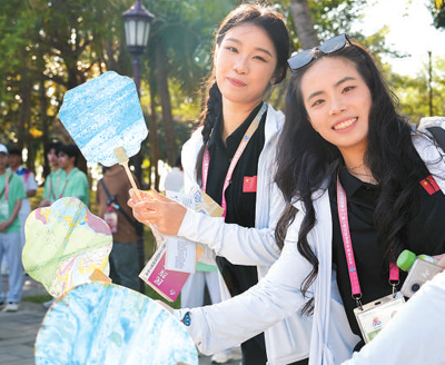 在第十二届全国少数民族传统体育运动会民族大联欢活动上,年轻人展示漆扇。新华社记者 胡 超摄